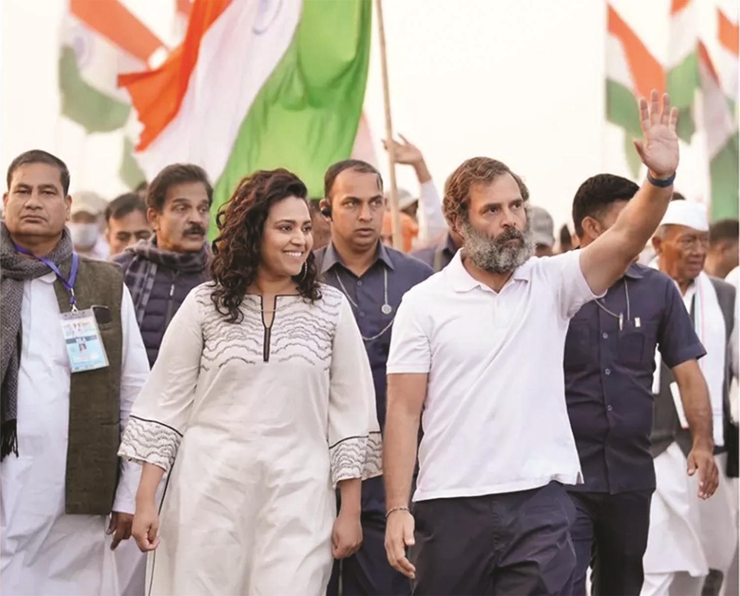 فی الحال راہل گاندھی کی بھارت جوڑو یاترا کا قافلہ مدھیہ پردیش کے اْجّین سے گزررہاہے۔ جہاں سوارا بھاسکر کو اس ریلی میں راہل گاندھی کے ساتھ قدم سے قدم ملاتے ہوئے دیکھا جارہاہے۔ راہل گاندھی کے ساتھ سوارا بھاسکر کی تصاویر سوشل میڈیا پر بحث کا موضوع بنی ہوئی ہیں۔ جس کی وجہ سے ایک طبقہ اس معاملے میں سوارا بھاسکر کی تعریف کر رہا ہے تو دوسرا طبقہ جو حکومت کے قریب مانا جاتا ہے، اداکارہ پر کڑی تنقید کر رہا ہے۔یہ پہلا موقع نہیں ہے جب کوئی فلم اسٹار کانگریس لیڈر راہل گاندھی کی بھارت جوڑو یاترا کا حصہ بنا ہو۔ سوارا بھاسکر سے پہلے راہل کی ریلی میں اداکارہ رشمی دیسائی، ریا سین، اکانکشا پوری، پوجا بھٹ اور تجربہ کار اداکار امول پالیکر جیسے کئی فلمی ستارے شامل ہوچکے ہیں۔ بالی ووڈ انڈسٹری کی ان مشہور شخصیات کی اس’بھارت جوڑو یاترا‘ میں دلچسپی کا اظہار بحث کا موضوع بن گیا ہے۔ اس کی وجہ سے یاترا کو مزید مقبولیت مل رہی ہے اور عوام ہاتھو ںہاتھ لے رہی ہے۔