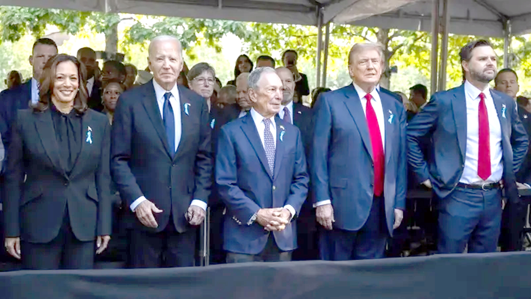 ڈیموکریٹک صدارتی نامزد نائب صدر کملا ہیرس، صدر جو بائیڈن، مائیکل بلومبرگ، ریپبلکن صدارتی امیدوار سابق صدر ڈونلڈ ٹرمپ اور ریپبلکن نائب صدارتی امیدوار سین JD Vance، R-Ohio، 23 ویں 9/11 کی یادگاری تقریب میں شرکت کر رہے ہیں۔ڈیموکریٹک صدارتی نامزد نائب صدر کملا ہیرس، صدر جو بائیڈن، مائیکل بلومبرگ، ریپبلکن صدارتی امیدوار سابق صدر ڈونلڈ ٹرمپ اور ریپبلکن نائب صدارتی امیدوار سین JD Vance، R-Ohio، 23 ویں 9/11 کی یادگاری تقریب میں شرکت کر رہے ہیں۔نیویارک کے سابق میئر مائیکل بلومبرگ بھی بائیڈن اور ٹرمپ کے درمیان کھڑے دیکھے جا سکتے ہیں۔