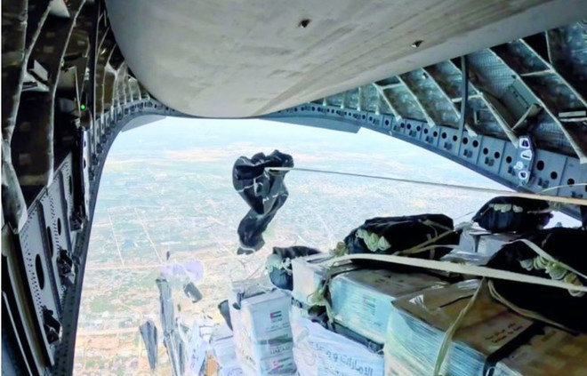 اردن اور اماراتی فضائیہ کی جانب سے شمالی غزہ کے متاثرین کے لیے مشترکہ امدادی ایئرڈراپ آپریشن کیا گیا ۔متحدہ عرب امارات کی سرکاری خبررساں ایجنسی ’وام‘ کے مطابق مشترکہ امدادی آپریشن اردن اور امارات کے درمیان غزہ میں فلسطینی عوام کو امداد پہنچانے کے لیے تعاون کے ضمن میں کیا گیا ہے۔ایئرڈراپ آپریشن کا مقصد شمالی غزہ اور ان علاقوں میں امداد پہنچانا ہے جہاں زمینی رسائی مشکل ہے۔مشترکہ آپریشن میں غزہ میں 22 ٹن امدادی سامان ایئرڈراپ کیا گیا، جبکہ امدادی آپریشن کو الفارس الشہم تھری کا نام دیا گیا۔واضح رہے کہ متحدہ عرب امارات کی جانب سے قبل ازیں طیاروں، بحری جہازوں اور ٹرکوں کے ذریعے بھی امدادی سامان غزہ کے متاثرین کے لیے ارسال کیا جا چکاہے۔بھوک و افلاس کے مارے غزہ کے فلسطینیوں کیلئے فضائی امداد بھی امتحان بن گئی۔غیر ملکی ذرائع ابلاغ کے مطابق امدادی سامان کے حصول کے لئے سمندر میں چھلانگ لگانے والے بارہ فلسطینی ڈوب گئے جبکہ خشکی پر گرنے والے امدادی سامان لینے کی کشمکش میں بھگدڑ سے چھ فلسطینی شہید ہوگئے۔