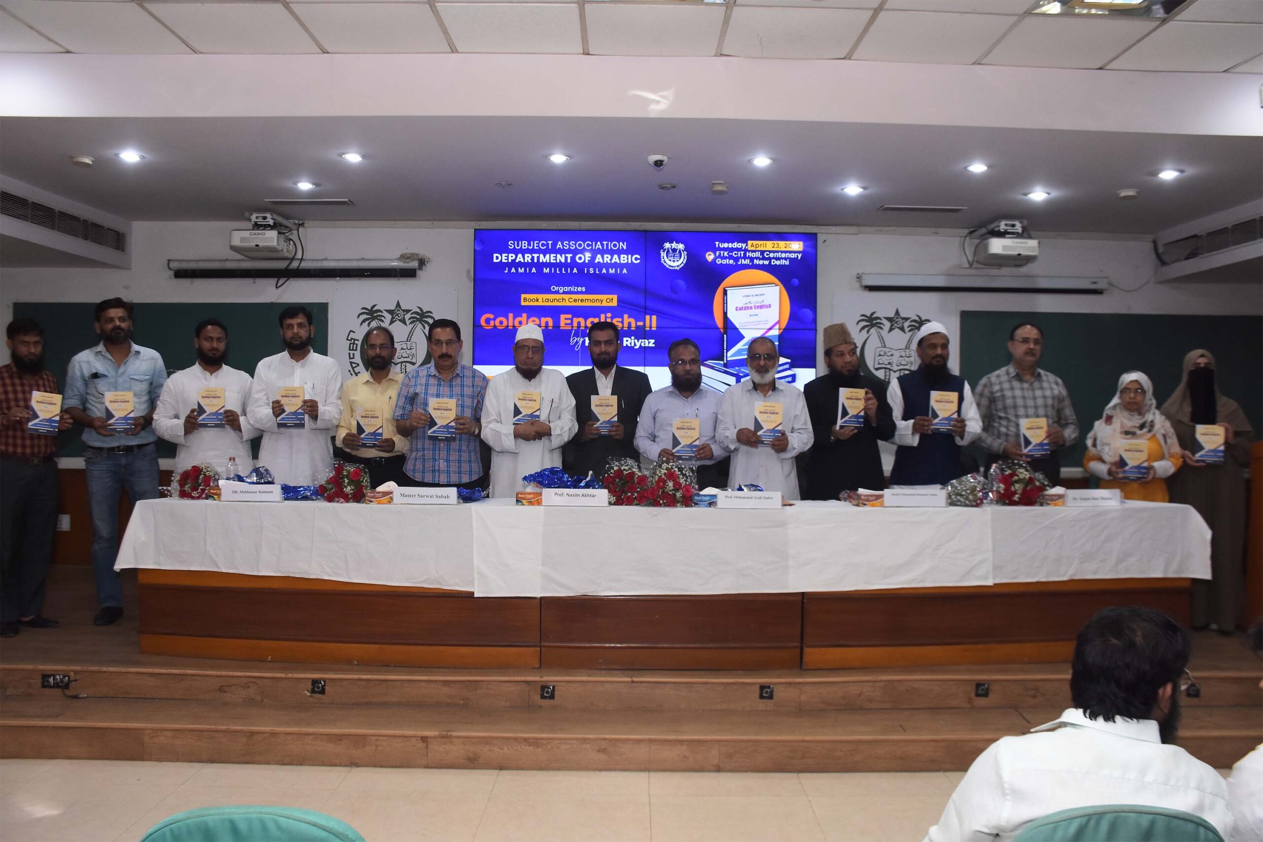 نئی دہلی،پریس ریلیز،ہماراسماج: شعبۂ عربی کے طلبہ کی انجمن النادی العربی کے زیر اہتمام جامعہ ملیہ اسلامیہ کے ایف ٹی کے ہال میں پروفیسر نسیم اختر صدر شعبۂ عربی جامعہ ملیہ اسلامیہ کی صدارت میں شعبہ کے طالب علم حبیب ریاض کی کتاب ’’ گوگڈن انگلش دوسرا حصہ‘‘ کی تقریب رسم اجراء منعقد ہوئی ، مہمان خصوصی کی حیثیت سے پروفیسر محمد ایوب ندوی سابق ڈائریکٹر انڈیا عرب کلچرل سینٹر اور سابق صدر شعبۂ عربی، جامعہ ملیہ اسلامیہ نے شرکت کی۔ جب کہ اس پروگرام میں مولانا ابو الکلام آزاد اسلامک اویکنگ سینٹر، نئی دہلی کے صدر مولانا محمد رحمانی مدنی ، ڈاکٹر ارقم رئیس پرنسپل جامعہ اسلامیہ سنابل نئی دہلی اور اسی ادارہ کے انگلش کے سینئر استاذ ماسٹر ثروت نے مہمان اعزازی کی حیثیت سے شرکت کی۔ پروگرام کا آغاز تلاوت کلام پاک سے ہوا اس کے بعد شعبہ کے بی اے سال آخر کے طالب علم محمود عالم نے کتاب کا تعارف پیش کیا۔ پروفیسر محمد ایوب ندوی نے اپنے خطاب میں حبیب ریاض کو مبارک باد دیتے ہوئے اردو زبان کے طلبہ کو انگلش سیکھنے کے لئے اس کتاب کی افادیت اور اہمیت پر روشنی ڈالی اور اس سے استفادہ کا مشورہ دیا، مولانا محمد رحمانی نے حبیب ریاض کو مبارک باد دیتے ہوئے کہا کہ آج ہمارے مدرسہ کے فارغ التحصیل طالب علم کی کتاب کو دیکھ کر خوشی ہورہی ہے آپ نے طلبہ وطالبات سے مخاطب ہو کر کہا کہ آپ یو نیورسٹی میں محنت سے تعلیم حاصل کریں۔
