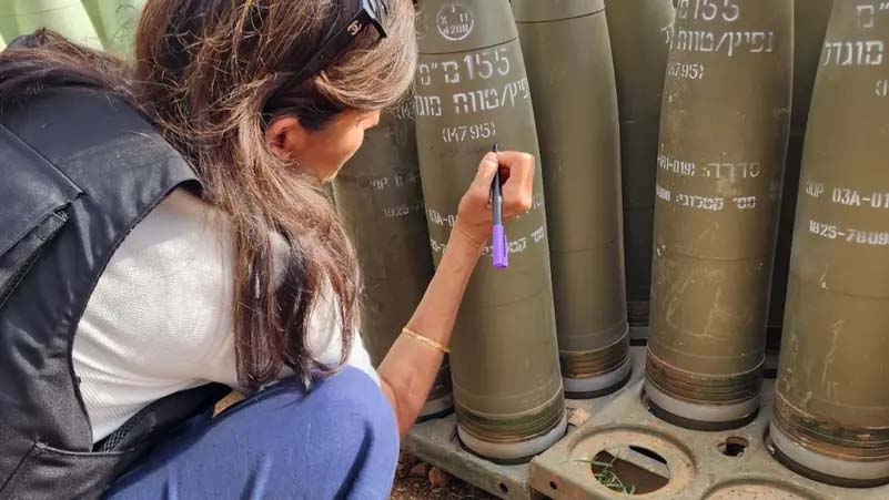 واشنگٹن (یو این آئی) سابق امریکی صدارتی امیدوار نکی ہیلی کی تصویر سوشل میڈیا پر گردش کر رہی ہے جس میں ان کو لبنان کے ساتھ واقع شمالی سرحد کے قریب مقامات کا دورہ کرتے ہوئے اسرائیلی شیل پر ’انہیں ختم کردو‘ لکھتے ہوئے دیکھا جاسکتا ہے۔خبر رساں ادارے ’اے ایف پی‘ کے مطابق یہ تصویر منگل کو ایکس پر اسرائیلی پارلیمان کے رکن اور اقوام متحدہ میں سابق سفیر ڈینی ڈینن نے پوسٹ کی جو نکی ہیلی کے دورے پر ان کے ساتھ تھے۔