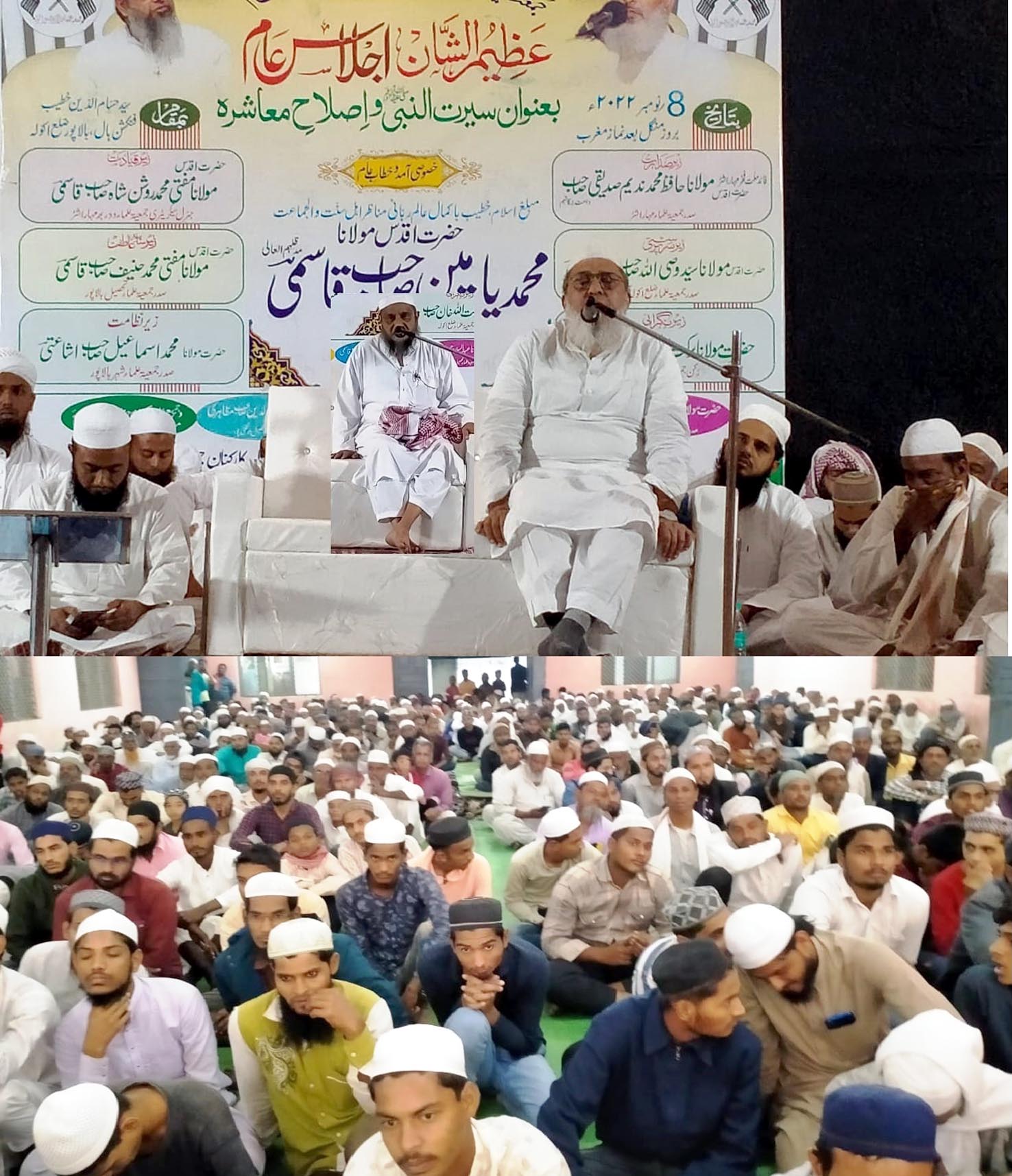اکولہ: آج یہاں جمعیۃعلماءکے زیر اہتمام سید حسام الدین خطیب فنگشن ہال بالاپور ضلع اکولہ میں عظیم الشان اجلاسِ عام بعنوان سیرت النبی صلی اللہ علیہ وسلم واصلاحِ معاشرہ منعقد ہوا جس کا آغاز مفتی مستقیم صاحب مظاہری کی تلاوت کلام اللہ سے ہوا، حافظ محمد شارق صاحب نے نعتیہ کلام پیش کیا،حافظ عبد الہادی نے جمعیۃکاترانہ پیش کیا۔ مولانا محمد اسماعیل صاحب اشاعتی (صدر جمعیۃعلماءشہر بالاپور)نے جمعیۃعلماءمہا راشٹر کے صدر مولانا حافظ محمد ندیم صدیقی صاحب کی ہدایت پر علاقہ ودربھہ میں منعقد کئے جارہے سیرت النبی واصلاحِ معاشرے کے پروگرامات کے مقاصد پر روشنی ڈالی۔مفتی محمد حنیف صاحب قاسمی (صدر جمعیۃعلماءتحصیل بالاپور )نے سیرت کے مختلف پہلو ؤں پر گفتگو کرتے ہوئے فرمایاکہ رسول اللہ کی ذات ہمارے لئے نمونہ ہیں عبادات ، معاملات ، معاشرت ،اخلاقیات میں سدھار کےلئے اپنی زندگیوںکو سیرت النبی صلی اللہ علیہ وسلم کے مطابق ڈھالنا ہوگا۔ مہمان خصوصی حضرت مولانا محمد یامین صاحب قاسمی مبلغ دارالعلوم دیوبند نے اپنے کلیدی خطاب میںجمعیۃعلماءہند کااس ملک کی تعمیر میں کیا کردار رہا ہے نیزجمعیۃعلماءکے مقاصد پر روشنی ڈالتے ہوئے فرمایا کہ سیرت النبی پر عمل کرناہی اصلاحِ معاشرہ ہے نیز فرمایا کہ مسلمانوں کی اصلاح قرآن کی تلاوت میں، تزکیہ میں، اپنے مسائل کو علماءکی خدمت میں جاکر حل کروانے میں، نیز معاملات کی درستگی میں ایذارسانی سے پرہیز کرنے میں پوشیدہ ہے۔ صدر اجلاسِ حضرت مولانا مفتی محمد روشن صاحب قاسمی جنرل سیکریٹر ی جمعیۃعلماءودربھ مہاراشٹر نے رقت سوز اور ردمندانہ خطاب میں فرمایاکہ ہمارے نبی صرف عبادات میں ہی آئیڈیل نہیں ہیں بلکہ ہر معاملات لین دین ، شادی بیاہ میں بھی آئیڈیل ہیں شادیوں کو سادگی اور بغیر جہیز کے کرنے پر ترغیب دیتے ہوئے نوجوانوں کو کھڑے کرواکر عزم کروایا کہ شادیاں سادگی اور بغیر جہیز لئے کریں گے۔ مولانا سید وصی اللہ صاحب مظاہری (صدرجمعیۃعلماءضلع اکولہ )نے اپنے خطاب میں فرمایا کہ افراد کے مجموعے کانام معاشرہ ہے،اپنی ذات سے اصلاح کا کام شروع کریں تو دھیرے دھیرے معاشرے کی اصلاح ہونے کے امکانات ہیں ورنہ خالی بیانات ہوں فکرِاصلاح نہ ہو تو اصلاحِ معاشرہ ممکن نہیں ہے۔