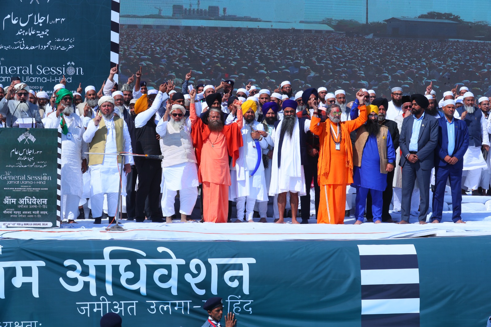نئی دہلی ۱۲؍ فروری : جمعیۃ علماء ہند کے 34ویں اجلاس عام کے اختتام کے بعد قوم کے نام جاری ایک پیغام میں کہا گیا ہے کہ جمعیۃ علماء ہند مذہبی منافرت اور فرقہ واریت کو پورے ملک کے لیے نقصان عظیم تصور کرتی ہے جو ہماری دیرینہ وراثت سے میل نہیں کھاتی ۔ یہ پیغام آج دہلی کے رام لیلا میدان میں لاکھوں کے مجمع کے سامنے جمعیۃ علماء ہند کے صدر مولانا محمود اسعد مدنی نے پڑھ کر سنایا، جہاں سبھی مذاہب کے رہ نما موجود تھے ۔اس سے قبل دارالعلوم دیوبند کے مہتمم مولانا مفتی ابوالقاسم نعمانی نے باـضـابطہ عہدنامہ پیش کیا ، جس کی لفظ بہ لفظ دوہرا کر پورے مجمع نے کھڑے ہو کر تائید کی ۔اس اجلاس کی صدارت مولانا محمود اسعد مدنی نے کی، رام لیلا میدان کھچا کھچ بھرا ہوا تھا جہاں دو لاکھ لوگ موجود تھے ۔لوگوں نے عہد لیا کہ وہ مذہبی رہ نمائوں اور مقد س کتابوں کا کبھی اپمان نہیں کریں گے ، ہنسا اور نفرت سے سماج کو آزاد کریں گے اوردیش کی رکشا ، سرکشا ، مان سمان او راکھنڈتا کے لیے پریاس کریں گے ۔