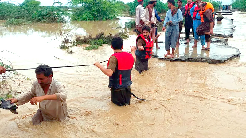 اسلام آباد :پاکستان میں حکام کم از کم 16 لاکھ افراد کو شدید سیلاب سے بچانے کے لیے ہر ممکن اقدامات کرنے میں مصروف ہیں۔ دریاؤں میں مسلسل طغیانی کے باعث پانی دیہاتوں میں داخل ہو رہا ہے۔ یہ بات بدھ کو حکام اور اقوامِ متحدہ نے بتائی۔قدرتی آفات سے نمٹنے کی قومی ایجنسی کے مطابق دریاؤں میں پانی کی سطح بلند ہونے، شدید بارشوں سے آنے والے تباہ کن سیلاب اور گلیشیائی جھیلوں کے پھٹنے سے پیدا ہونے والی تودے گرنے کی صورتِ حال کے نتیجے میں جون سے اب تک 928 افراد جاں بحق ہو چکے ہیں۔اقوامِ متحدہ کے ادارہ برائے آفات کے مطابق اب تک ملک کے شمالی حصے، شمال مغربی پہاڑی علاقے اور وسطی علاقے سمیت لگ بھگ 60 لاکھ افراد سیلاب سے متاثر ہوئے ہیں۔اقوامِ متحدہ کے دفتر برائے رابطہ انسانی امور نے کہا کہ تقریباً 16 لاکھ افراد کو بڑے پیمانے پر آنے والے سیلاب کا خطرہ ہے اور ممکن ہے کہ انھیں منتقل کرنے یا مدد کرنے کی ضرورت پڑے، کیونکہ دریاؤں میں آنے والا سیلاب اب جنوبی صوبہ سندھ تک جا پہنچا ہے۔سندھ کے وزیر اعلیٰ مراد علی شاہ نے کہا ہے کہ "ہم نے تقریباً دو لاکھ افراد کو دریاؤں کے کنارے سے منتقل کیا ہے اور مزید لوگوں کو بچانے کے لیے تیار ہیں۔”کراچی میں بارشوں کے نتیجے میں ہونے والی اموات کی تعداد 7 ہوگئی، گزشتہ دو روز کے دوران وقفے وقفے سے مسلسل بارش نے تباہی مچا دی، ملیر اور لیاری کی ندیاں دریاؤں میں تبدیل ہوگئیں، نشیبی علاقے ڈوب گئے، میئر کی درخواست پر چیف سیکریٹری سندھ نے فوج طب کرلی، شہر کے بعض علاقوں میں سیلابی صورتحال کے باعث ریسکیو 1122، پاک فوج اور رینجرز کی ٹیموں نے سیکڑوں شہریوں کو ریسکیو کیا۔تفصیلات کے مطابق ریسیکیو سروسز نے بتایا ہے کہ آج شہر میں بارش کے نتیجے میں ہونے والے مختلف واقعات میں مزید تین افراد جان کی بازی ہار گئے، جس کے بعد گزشتہ روز سے اموات کی تعداد بڑھ کر 7 ہوگئی، جبکہ تین افراد لاپتا ہیں۔ایدھی ریسکیو اہلکاروں نے گڈاپ ٹاؤن میں کونکر ندی میں گری ایک کار میں سے ایک مرد اور ایک خاتون کی لاشیں برآمد کیں۔ ایدھی فاؤنڈیشن کے جاری کردہ بیان کے مطابق جاں بحق ہونے والوں کی شناخت 60 سالہ نبو گلاب اور 45 سالہ جاوید شاہ سے ہوئی ہے۔علاوہ ازیں پولیس سرجن ڈاکٹر سمعیہ سید نے ڈان کو بتایا کہ 18 سالہ نوجوان احمد قادر کی لاش عباسی شہید اسپتال لائی گئی۔ انہیں نارتھ ناظم آباد بلاک سی سے منتقل کیا گیا تھا، جہاں وہ کرنٹ لگنے سے جاں بحق ہوگئے۔ریسکیو 1122 کے جاری کردہ بیان کے مطابق ملیر ندی میں 2 افراد کے لاپتا ہونے کے بعد ایک شخص کو زندہ بچا لیا گیا۔