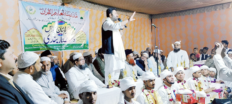 نئی دہلی، دہلی کی معروف دینی درسگاہ مدرسہ تعلیم القرآن تکیہ کالے خاں میردرد روڈ نئی دہلی میں مولانا محمد قاسم نوری مہتمم وبانی مدرسہ ہٰذا کی صدارت اور مولانا ارشد ندوی امام وخطیب مسجد مجیدیہ دہلی کی نظامت میں عظیم الشان اجلاس ودستار بندی کا انعقاد کیا گیا۔ پروگرام کی سرپرستی مولانا نثار الحسینی امام وخطیب انجمن والی مسجد پہاڑی بھوجلہ ، جبکہ مہمان خصوصی کی حیثیت سے دہلی کے ڈپٹی میئر آل محمد اقبال نے شرکت کی۔ پروگرام کا آغاز مدرسہ ہٰذا کے استاذ قاری مطہرریاض کی تلاوت قرآن کریم اور سرزمین دیوبند سے آئے معروف نعت خواں مولانا احسن الزماں کی نعت پاک سے ہوا۔ ڈپٹی میئر آل محمد اقبال نے کہاکہ حافظ قرآن کے نزدیک میئر ، ڈپٹی ، وزیراعلیٰ، وزیراعظم حتیٰ کہ دنیا کا ہر عہدہ ومنصب کچھ نہیں ہے ، اصل خوش نصیب اور اعلیٰ منصب والے یہ حافظ قرآن ہیں جن کے سینوں میں دنیا کی سب سے افضل اور سب سے بڑی معتبر ومستند کتاب محفوظ ہے۔ اس پروگرام میں شرکت میرے لیے باعث فخر ہے ، کیونکہ یہ محفل ، یہ مجلس دنیا کی ساری پارٹیوں اورپروگرام سے بہتر اور نورانی ہے۔ انہوں نے اس موقع پر تکیہ کالے خاں کے لوگوں پارک میں تعمیراتی کام کے علاوہ کئی اہم پروگراموںکا اعلان بھی کیا۔ اس موقع پر دارالعلوم وقف دیوبندکے استاذ اسجد عقابی قاسمی نے خطاب کرتے ہوئے کہا کہ اللہ کا بہت بڑا کرم واحسان ہے کہ اس نے ہم انسانوںکےلئے قرآن کریم نازل فرمایا۔ انہوں نے کہاکہ قرآن کریم کوسینے میں محفوظ کرنے والے کے والدین کو اللہ تعالیٰ قیامت کے ایسا تاج پہنائے گا جو سورج کی روشنی سے زیادہ چکمدار ہوگا،یہ ہے قرآن کریم حفظ کرنے والوں کےلئے سعادت۔دارالعلوم وقف دیوبند کے استاذ مولانا سجاد حسین قاسمی نے پرمغز اور مدلل ومفصل خطاب کیا۔ مفتی نثار الحسینی نے کہاکہ بہت ہی خوشی ومسرت کی بات ہے کہ دو رو ز بعد شب برآت اور ہولی ہے، جسے ہمیں پرسکون ، بھائی چارگی اور اتحاد واتفاق کے ساتھ منانا ہے۔ ہمیں ایک دوسرے کے تہوار کا خاص خیال رکھنا ہے۔ معروف مداح رسول قاری محمد دانش ابرارکشن گنجوی نے اپنی سریلی آواز سے نعت پاک اور نظمیں پیش کرکے خوب دادوتحسین حاصل کی۔ بعد ازیں مدرسہ سے قرآن پاک حفظ مکمل کرنے والے آٹھ حفاظ کرام صدیقین ابن شمس الحق، محمد عیان ابن نظام الدین، محمدیاسین ابن حافظ ابوالکلام، محمد راحل ابن داؤد، نظرالحق ابن محمد جمشید، محمد گلفراز ابن علیم الدین،محمد ارشد ابن اوصاف،محمد آزاد ابن معراج الدین کی علمائے کرام اور مہمانان عظام کے ہاتھوں دستاربندی اور گرانقدر انعامات سے نوازا گیا۔ بعدازیں سالانہ امتحان میں پوزیشن لانے والے طلبہ محمد ارشدابن اوصاف، محمد دانش ابن عبدالجبار، محمد استخار ابن محمد اشفاق، محمد گلفراز ابن علیم الدین، محمد راحل ابن داؤد، امام الدین ابن منظرعالم مرحوم، محمد یوسف ابن فیروز، فراست علی ابن اسرار، رفعت اللہ ابن عبدالرؤف، ابوطالب ابن شمس الحق، ہدایت اللہ ابن سہیل اور نواز ابن سرمان عل کو بھی شیلڈ اور گرانقدر انعامات سے نوازا گیا۔ اخیر میں جمعیت علماءنئی دہلی کے صدر مولانا محمد قاسم نوری مہتمم وبانی مدرسہ ہٰذا نے تمام مہمانوں کا شکریہ ادا کرتے ہوئے مدرسہ کے عزائم اور منصوبوں پر روشنی ڈالی۔ پروگرام میں مولانا قاری ضیاءاللہ قاسمی منیجر جمعیتہ بک ڈپو بلیماران، مولانا عظیم اللہ صدیقی میڈیا انچارج جمعیت علمائے ہند، حاجی مبشر جمعیت علماءہند،حافظ افضل جمعیت بک ڈپو بلیماران، مولانا نوشاد عادل قاسمی،مفتی ذاکر قاسمی آرگنائز جمعیت علمائے ہند، حاجی اسعدمیا ں سکریٹری جمعیت علماءصوبہ دہلی، راکیش کمار کونسلر دہلی گیٹ، حاجی سلیم رکا ب گنج ، حاجی ندیم رکاب گنج، بھائی طارق ،کانگریس کے نوجوان لیڈر عبدالشکور خان،مولانا رفیق، حافظ عمران سنگم وہار، مولانا ساجد، مولانا تسلیم ،قاری شمس تبریز، حافظ نوشاد، بھائی لڈو، مولانا ابوبکروغیرہ نے بطور خاص شرکت کی۔