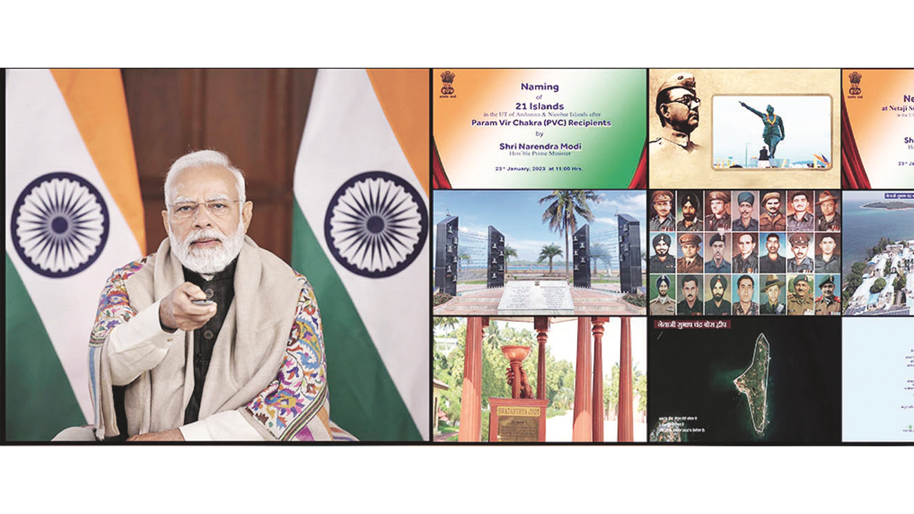 نئی دہلی، 23جنوری: وزیر اعظم نریندر مودی نے پیر کو کہا کہ آزادی کے بعد نیتا جی سبھاش چندر بوس کو بھلادینے کی کوشش کی گئی لیکن اب ملک انہیں ہر لمحہ یاد کر رہا ہے ۔جدوجہد آزادی میں نیتا جی کے تعاون، کامیابیوں اور قربانیوں کی یاد کو زندہ رکھنے کے لیے پچھلے آٹھ سالوں میں کئے گئے اقدامات کا ذکر کرتے ہوئے مسٹر مودی نے کہاکہ ’آج نیتا جی سبھاش کا یوم پیدائش ہے، ملک ’پراکرم دیوس‘ کے طور پر مناتا ہے‘۔ مسٹر مودی نے نیتاجی کی یوم پیدائش پر انڈمان و نکوبار میں منعقدہ ایک عظیم الشان تقریب میں کانفرنسنگ کے حصہ لیتے ہوئے ’پرم ویر چکر‘ فاتحین کے نام پر انڈمان ونکوبار کے 21جزائر کے نام رکھے۔ مسٹر مودی نے کہاکہ’آج 21ویں صدی دیکھ رہا ہے کہ کس طرح نیتا جی سبھاش کو آزادی کے بعد بھلانے کی کوشش کی گئی تھی، آج ملک ہر لمحہ اسی نیتا جی کو یاد کر رہا ہے ۔ انڈمان میں جس جگہ نیتا جی نے پہلی بار ترنگا لہرایا تھا، آج آسمان کو فلک بوس ترنگا آزاد ہند فوج کی طاقت کی تعریف کر رہا ہے‘۔ انہوں نے کہاکہ ’پچھلے 8-9سالوں میں ملک میں نیتا جی سبھاش چندر بوس سے متعلق بہت سے ایسے کام ہوئے ہیں، جو آزادی کے فوراً بعد ہو جانا چاہیے تھے ۔ لیکن اس وقت ایسا نہیں ہوا۔انڈمان و نکوبار جزائر کے 21جزائر کے نام میجر سومناتھ شرما، صوبیدار اور کیپٹن (اس وقت کے لانس نائک) کرم سنگھ، پیرو سنگھ، سیکنڈ لیفٹیننٹ راما رگھوبا رانے ، نائیک جادوناتھ سنگھ، میجر شیطان سنگھ، کمپنی کوارٹر ماسٹر حوالدار عبدالحمید، لیفٹیننٹ کرنل اردشیر برجورجی تاراپور، لانس نائک البرٹ ایکا، میجر ہوشیار سنگھ، سیکنڈ لیفٹیننٹ ارون کھیترپال، فلائنگ آفیسر نرملجیت سنگھ سیکھون، میجر راما سوامی پرمیشورن، نائب صوبیدار بانا سنگھ، کیپٹن وکرم بترا، کیپٹن منوج کمار پانڈے ، صوبیدار میجر سنجے کمار اور صوبیدار میجر سنگھ یادو (ریٹائرڈ) جیسے بہادر سپاہیوں کے نام پر رکھا گیا ہے‘۔ انڈمان میں ایک پہاڑی کیپٹن بترا کے نام بھی وقف کی گئی تھی، جنہوں نے کارگل جنگ میں فتح کا اعلان کیا تھا۔مسٹر مودی نے نیتا جی کے لیے وقف جزیرے پر تعمیر کی جانے والی یادگار کے ماڈل کی بھی نقاب کشائی کی۔ انہوں نے اس جزیرے پر جہاں وہ رہتے تھے نیتا جی کی زندگی اور ان کے تعاون کے لیے وقف ایک یادگار کا سنگ بنیاد بھی رکھا۔مسٹر مودی نے کہاکہ ’نیتا جی کی یہ یادگار، یہ جزیرے شہیدوں اور بہادر سپاہیوں کے نام پر رکھے گئے ہیں، ہمارے نوجوانوں اور آنے والی نسلوں کے لیے ایک لازوال ترغیب کا مقام بنیں گے‘۔ انہوں نے اس موقع پر جزائر انڈمان اور نکوبار کے لوگوں اور تمام ہم وطنوں کو مبارکباد دی اور نیتا جی سبھاش اور پرم ویر چکرا ایوارڈ یافتہ افراد کو خراج عقیدت پیش کیا۔