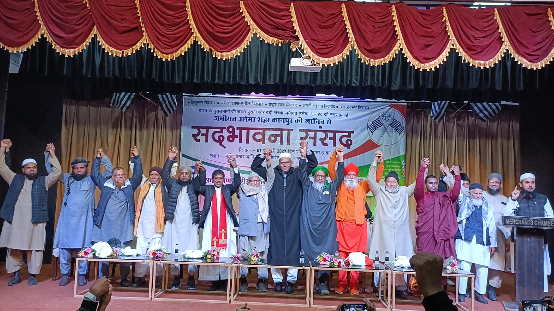 کانپور:۔جمعیۃ علماء شہر کانپور کے زیر اہتمام سول لائنس واقع مرچنٹ چمبر آڈیٹوریم میں جمعیۃ علماء شہر کانپور کے صدر ڈاکٹر حلیم اللہ خاں کی زیرصدارت سدبھاؤنا سنسد کے عنوان سے خیر سگالی نشست منعقد ہوئی۔ جس میں جمعیۃ علماء ہند کے ناظم عمومی مولاناحکیم الدین قاسمی، جمعیۃ علماء اتر پردیش کے صدر مولانا عبد الرب اعظمی کے ساتھ ہلدوانی سے تشریف لائے سکھ مذہبی رہنما ہرجوت سنگھ،قاضی شہر کانپور حافظ و قاری معمور احمد جامعی، قاضی شہر کانپور مفتی ثاقب ادیب مصباحی، نیو لائف چرچ کے صدر پاسٹر ڈائمنڈ یوسف، اکھل بھارتیہ بھکو مہاسنگھ اترپردیش کے صدر بھدنت دیپانکر مہارتھویر جی کے نمائندے بھنتے کھیما نند،جماعت اسلامی مشرقی یوپی کے سابق امیر مولانامحمد نعیم، جماعت اسلامی شہر کانپور کے ناظم عبد الحئی، جمعیۃ اہلحدیث کانپور کے سابق امیر مولانا اقبال محمدی کے علاوہ شہر کانپور و اطراف کی معزز شخصیات شریک رہیں۔